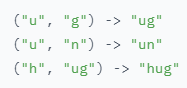merges[('a', 'b')] = 'X'